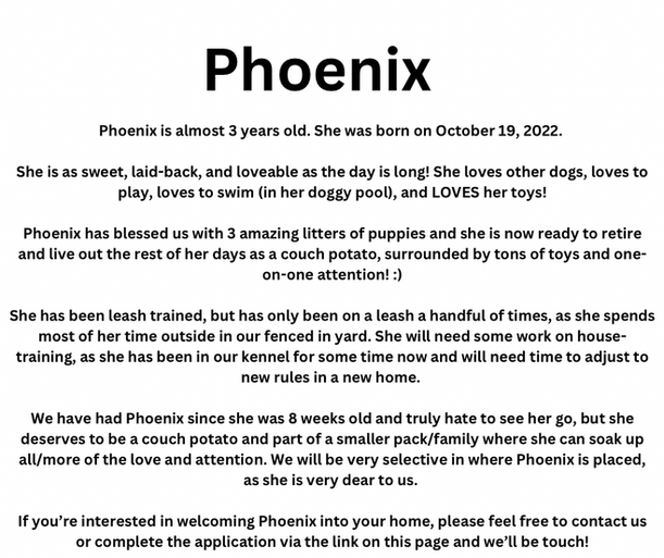 Please also read through the 3-3-3 rule on our application page as it is critical to consider when taking in an older dog.